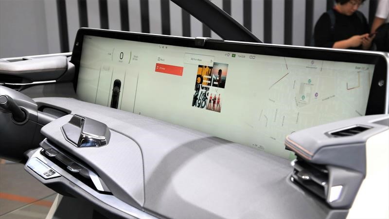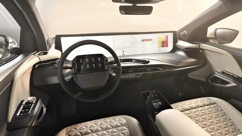 La marca dice que el habitáculo de este modelo se debe considerar como un verdadero salón digital, el cual está favorecido por un enorme techo panorámico flotante que aporta máxima luminosidad al ambiente. Obviamente el elemento que caracteriza el interior es la enorme pantalla táctil de 48 pulgadas que atraviesa transversalmente la parte superior del tablero de instrumentos; como si fuera poco, justo en el centro del enorme volante se ajusta otro monitor de siete pulgadas, el cual, se supone, ofrece toda la información y los controles que requiera el conductor. Obviamente los pasajeros traseros también disponen de dos tabletas, adosadas en los espaldares de las sillas delanteras.
