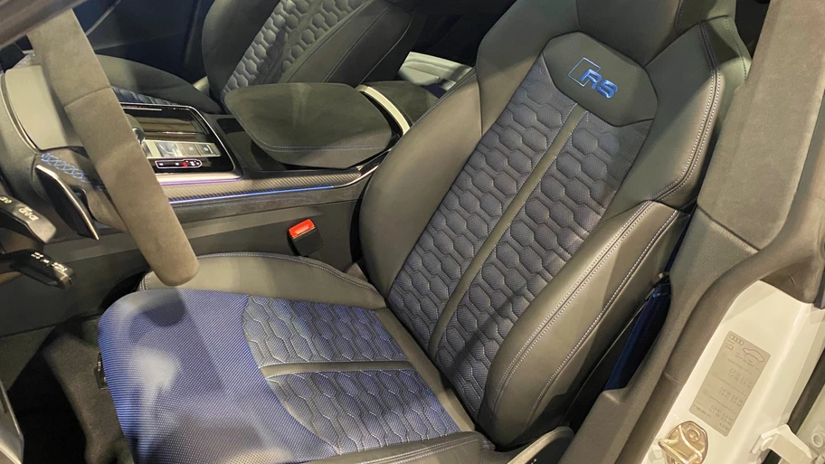 La puesta a punto del chasís también es protagonista: incorpora suspensión neumática adaptativa RS, amortiguación controlada, estabilización activa electromecánica (eAWS), dirección en las cuatro ruedas y el sistema Audi Drive Select con ocho modos de manejo. El poder de frenado queda a cargo de frenos cerámicos RS con mordazas azules o rojas.